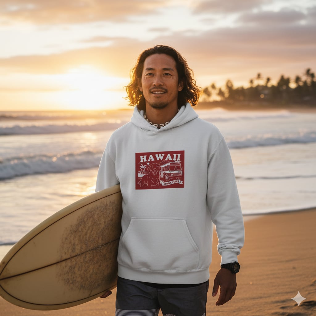 ハワイの陽気な雰囲気をまとった、リラックス感あふれる一枚。胸元には笑顔のゴールデンレトリバーと「ALOHA VIBES」の文字が映えるデザインで、シンプルながら存在感抜群