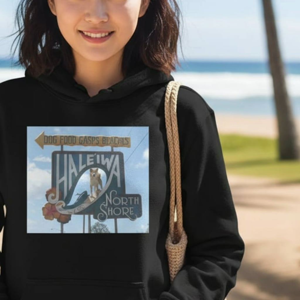 ハワイ・ノースショアの象徴「ハレイワサイン」と柴犬を組み合わせた遊び心あるデザイン。