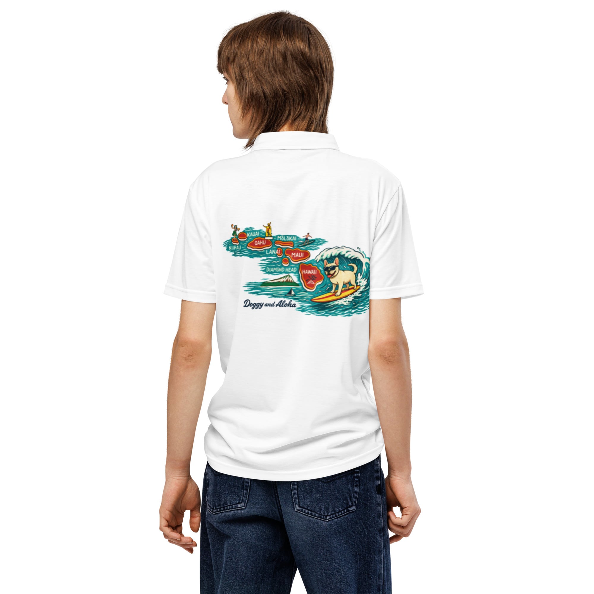 ハワイ諸島を背景に、波乗りするフレンチブルドッグが映える遊び心たっぷりの一枚。